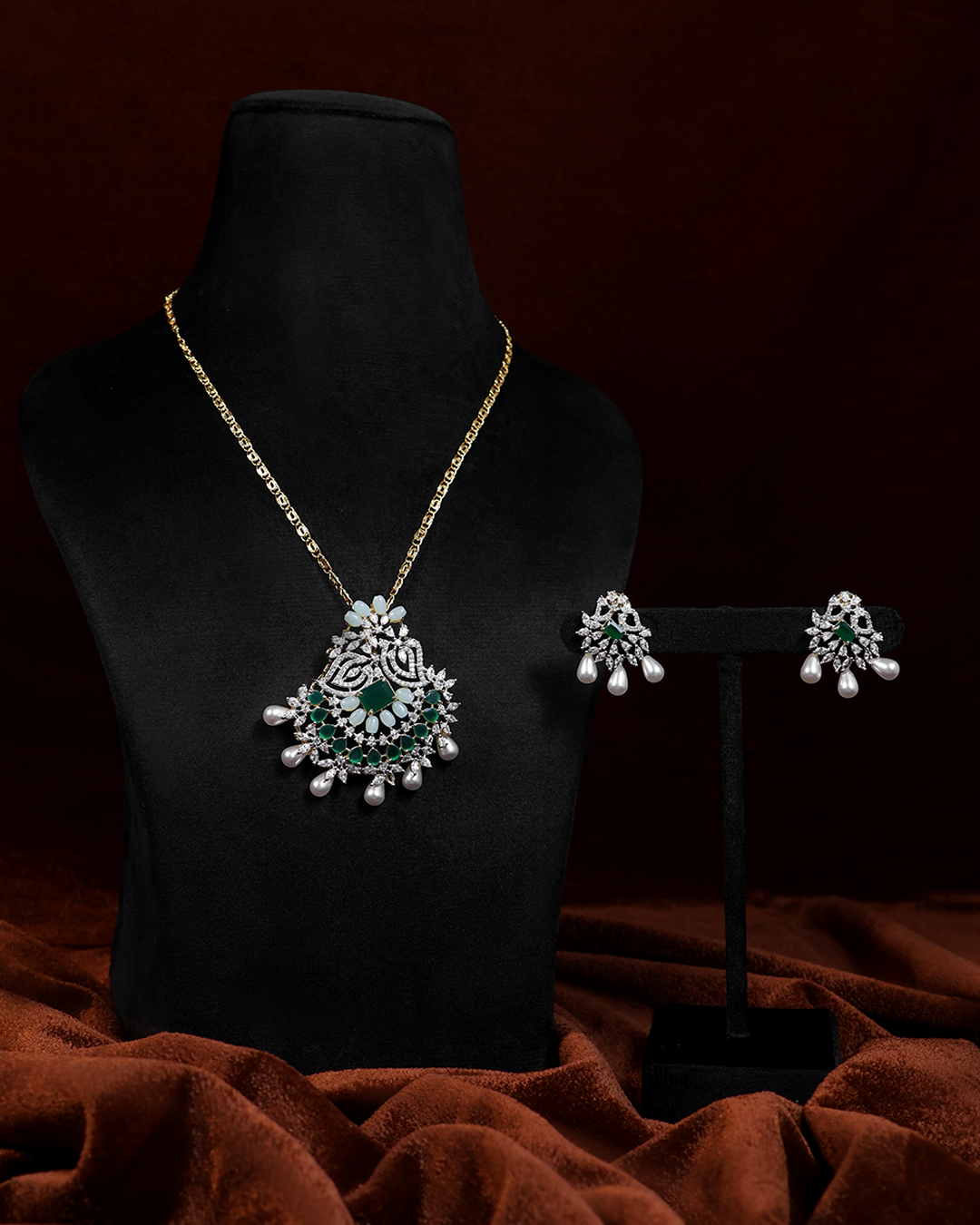 This elegant Emerald Drop Set features a beautifully crafted necklace and matching earrings, combining green and white tones for a striking contrast. Made with high-quality CZ stones and finished with G.J. polish, this set offers the brilliance and durability of fine jewelry at an accessible price. Perfect for adding a sophisticated touch to any outfit, it balances classic design with contemporary style.
