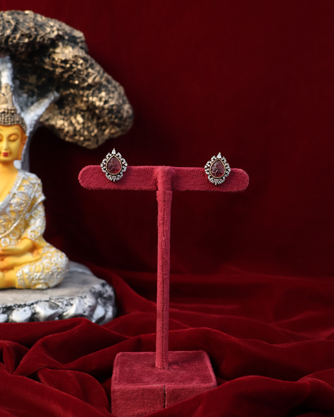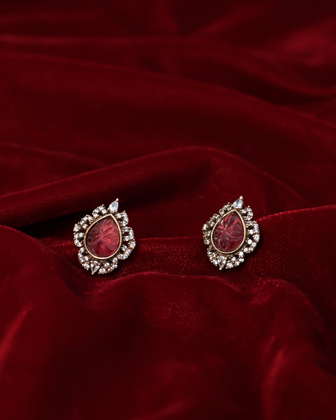 These Carved Rose Pink Teardrop Stud Earrings feature a delicate combination of red and white hues, adding a subtle yet elegant touch to any outfit. Crafted with attention to detail, they may oxidize over time, developing a unique patina that enhances their character. Perfect for those who appreciate refined craftsmanship and timeless style.