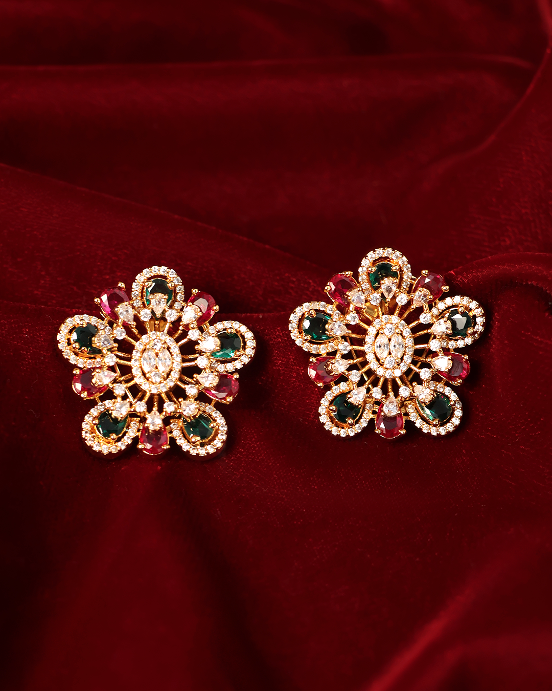 This exquisite earring set features a harmonious blend of red, green, and white hues, enhanced with a refined gold-plated polish. Designed as floral studs, they offer a sophisticated touch to any ensemble, combining vibrant colors with a polished finish for lasting elegance. Ideal for those seeking a timeless accessory that complements both traditional and contemporary styles.