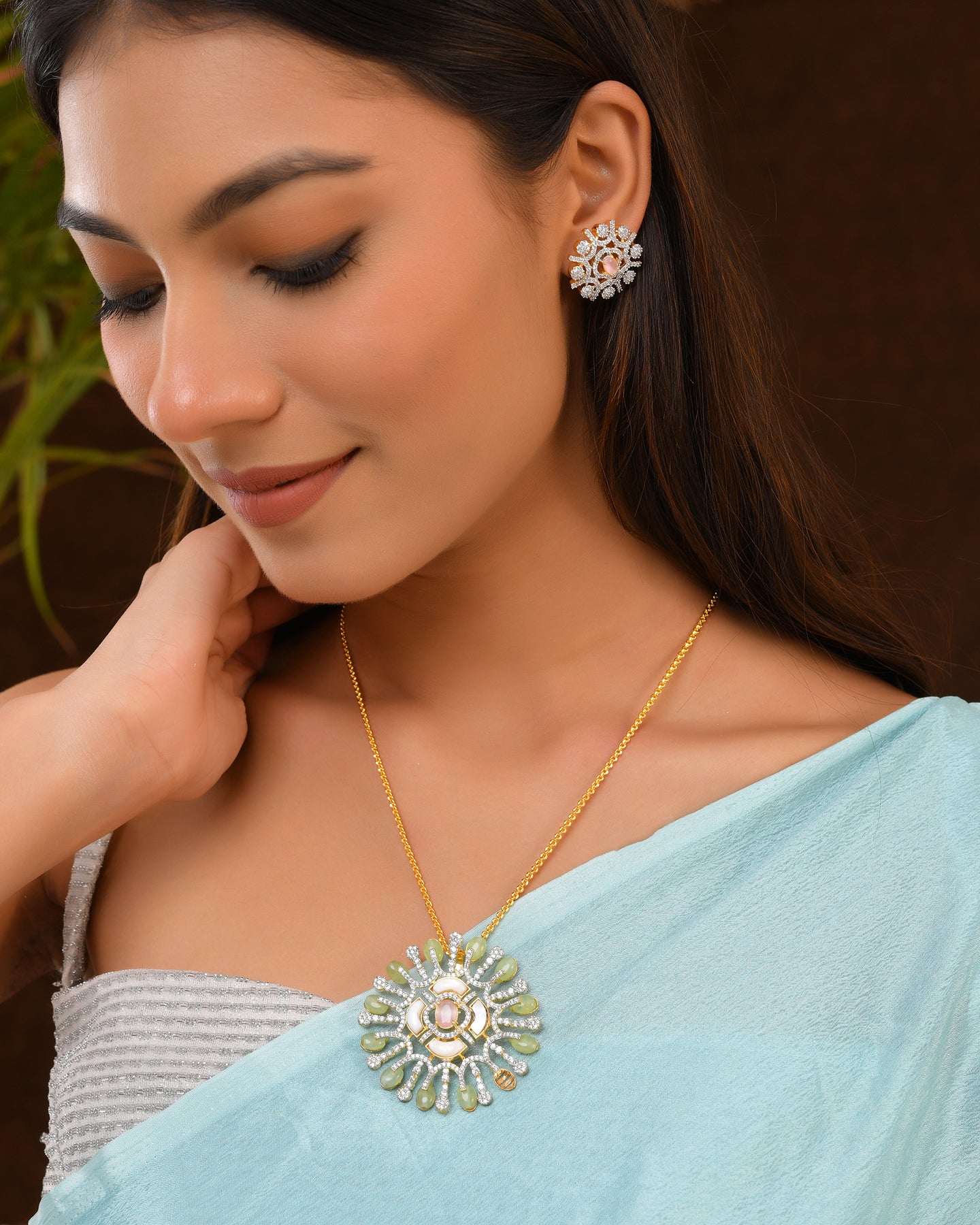 This elegant Mint Green Pendant Set features a delicate chain paired with a pendant showcasing a stunning champagne-colored center stone. Crafted with a combination of Mojonite and CZ stones, it is finished with a high-quality G.J. polish that enhances its brilliance and durability. Perfect for adding a refined touch to any outfit, this set balances subtle color with expert craftsmanship for lasting appeal.