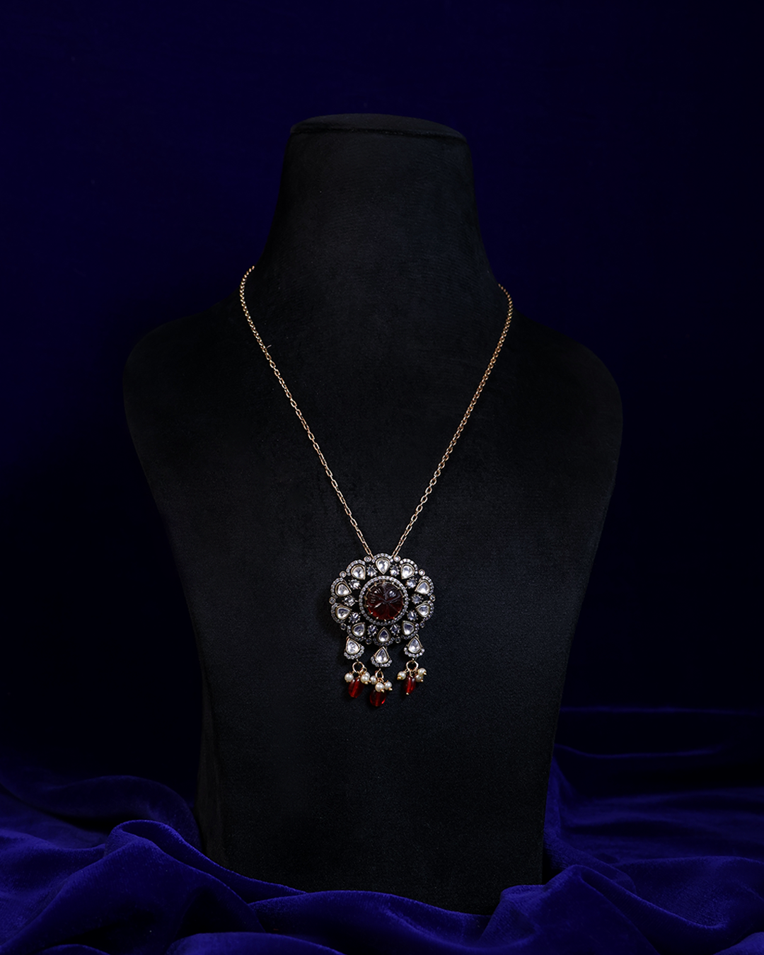 This exquisite vintage-inspired necklace features a finely crafted oxidized chain paired with a striking red mojonite locket. The combination of classic design and vibrant gemstone adds a royal sparkle to any ensemble, making it a timeless accessory for those who appreciate expert craftsmanship and elegant style.